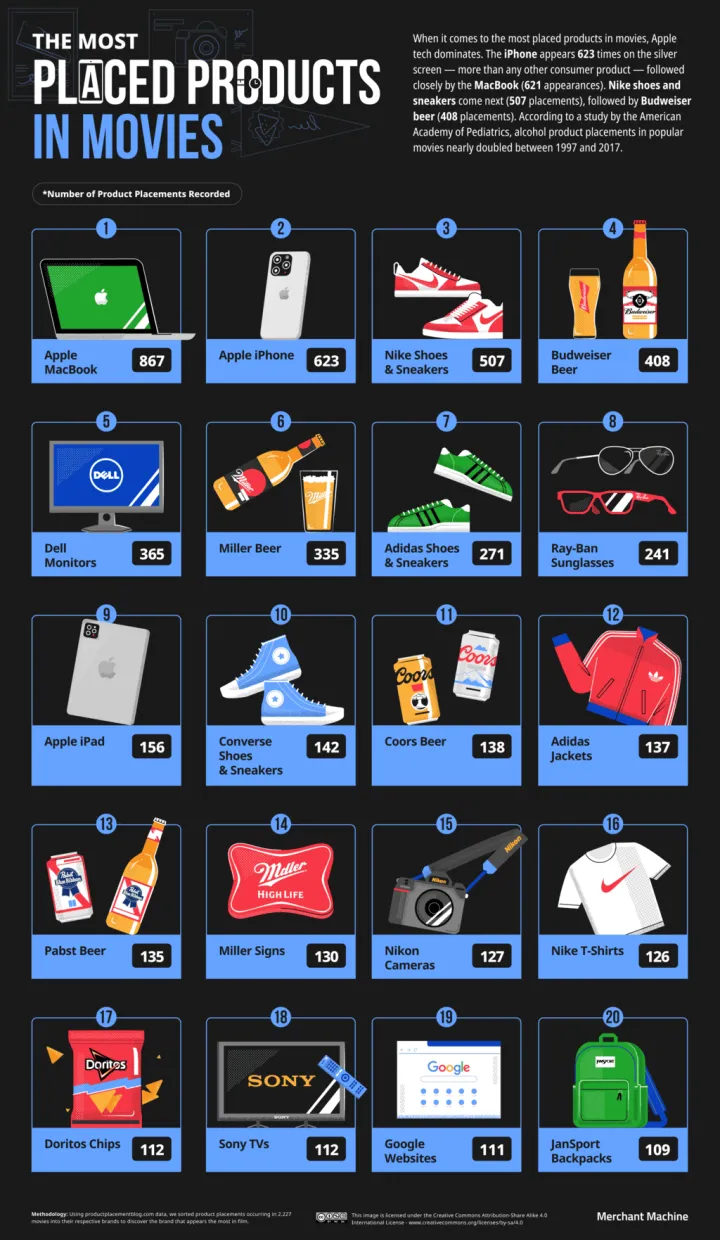也许正是这一点启发了Merchant Machine将节目和电影中的品牌植入放在一起。该网站访问了Product Placement博客,该博客对品牌在节目和电影中出现的位置进行了分类和分类,并评估了哪些品牌和产品在我们的屏幕上占据了最多的位置。