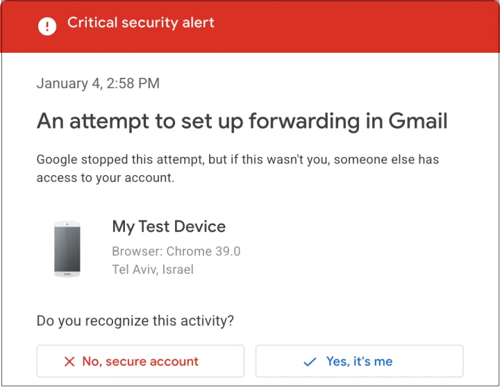 在不正当的人手中,所有这些功能都可以被利用来重新配置Gmail帐户,以便将您的电子邮件发送给其他人。因此,谷歌在周三的一篇博客文章中表示:“当采取这些行动时,谷歌将评估试图采取行动的会话,如果被认为存在风险,它将收到‘验证这是你’的提示。”