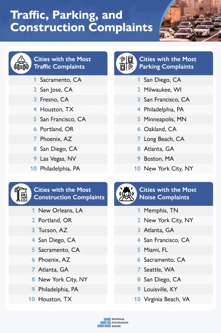 其他热门的讨论话题围绕着交通和停车。加州居民尤其对这些话题感到恼火,他们所在的四五个城市都在这两个类别的前十名中。萨克拉门托获得了交通投诉最多的奖项,圣地亚哥在停车方面位居榜首-出人意料地击败了纽约市(第10名)。