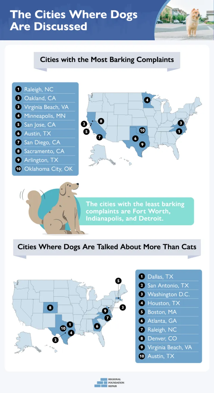 这项由Region Foundational Repair进行的分析评估了美国50个最大城市的58,735条帖子和354,972条评论的内容。这项研究考虑了200多个关键词,并将相似的词进行了分组–比如“叫、叫、叫和叫”–从而创建了“吠叫抱怨”等类别。