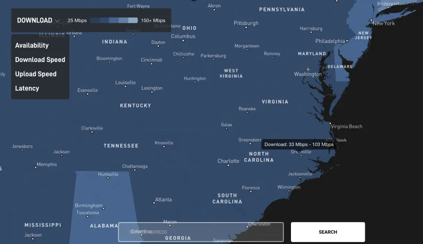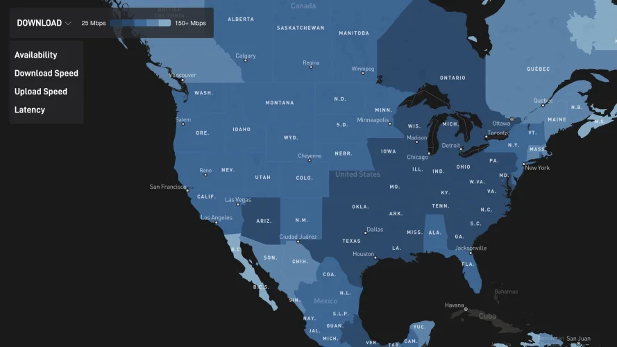StarLink.com上的覆盖地图最初是为了向用户显示他们是否会被列入住宅Starlink服务的等待名单。但在刚刚过去的这个周末,SpaceX增加了查看全美各州估计的下载、上传和延迟速度的功能。点击“可用性”图标旁边的下拉菜单即可访问该功能。
