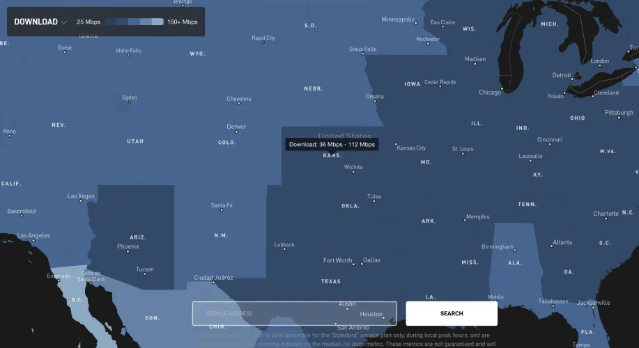 为了计算速度,地图补充道:“只有‘标准’服务计划的指标在当地高峰时段从20%到80%不等,每月更新一次。地图颜色基于每个指标的中位数。这些指标不是有保证的,将根据地理位置、一天中的时间、Wi-Fi性能和其他因素而变化。