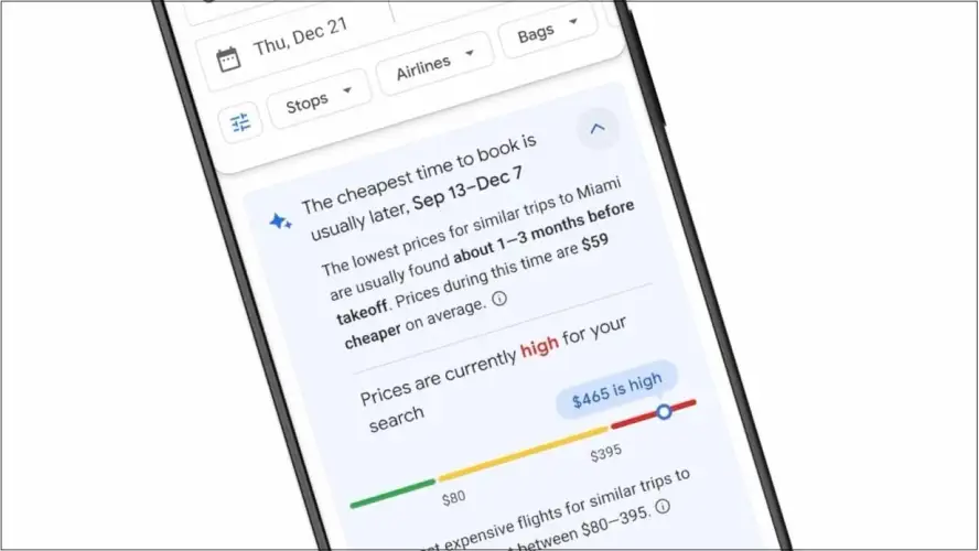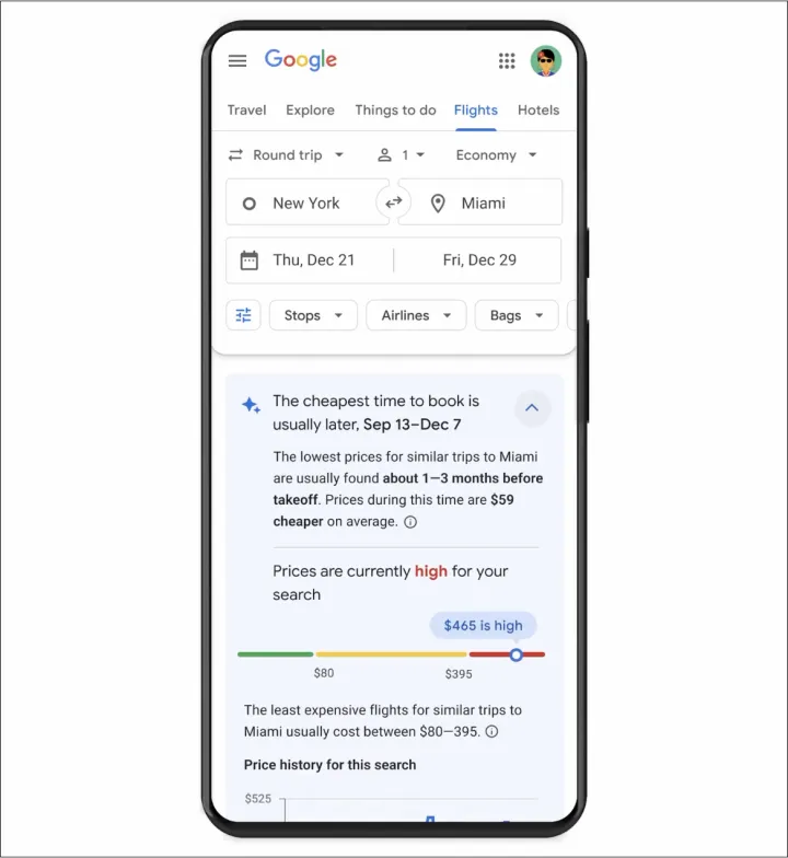 例如,谷歌展示了这一功能将建议9月1日之间的时间段。13日至12月7日通常是获得从纽约到迈阿密的最便宜航班的最佳时间。用户还可以点击包含更多详细信息的下拉菜单,这将建议他们在起飞前一到三个月购买机票,以节省59美元的票价。