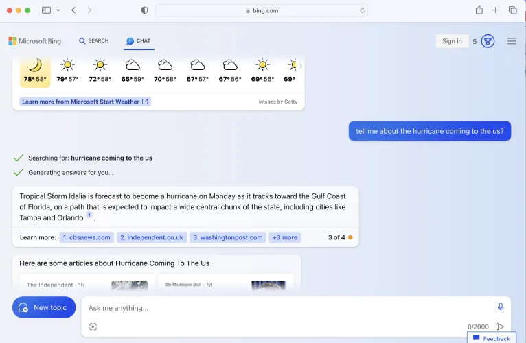 在Chrome上,转到bing.com/chat,你就会被带到必应聊天体验。但是,您可能需要使用您的Microsoft帐户登录,然后才能输入提示。