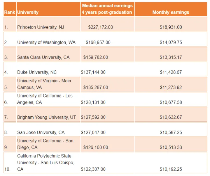 网络托管提供商Hostinger做了计算,找出了潜在薪资排名前十的学校。排名第一的是普林斯顿大学工程与应用科学学院。该校毕业生的年收入约为227,172美元。有些人,比如杰夫·贝佐斯,赚的比这多得多。