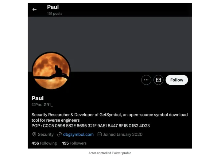这次攻击代表着朝鲜黑客的最新行动,至少自2021年以来,朝鲜黑客一直以同样的策略冒充安全研究人员,以IT安全社区为目标。在这场新的行动中,谷歌表示,朝鲜还在GitHub上发布了一个名为GetSymbol Project的免费调试工具,以诱使安全研究人员下载该工具。在现实中,该工具具有“从攻击者控制的域下载并执行任意代码的能力”,这意味着它可以秘密感染带有恶意软件的PC。