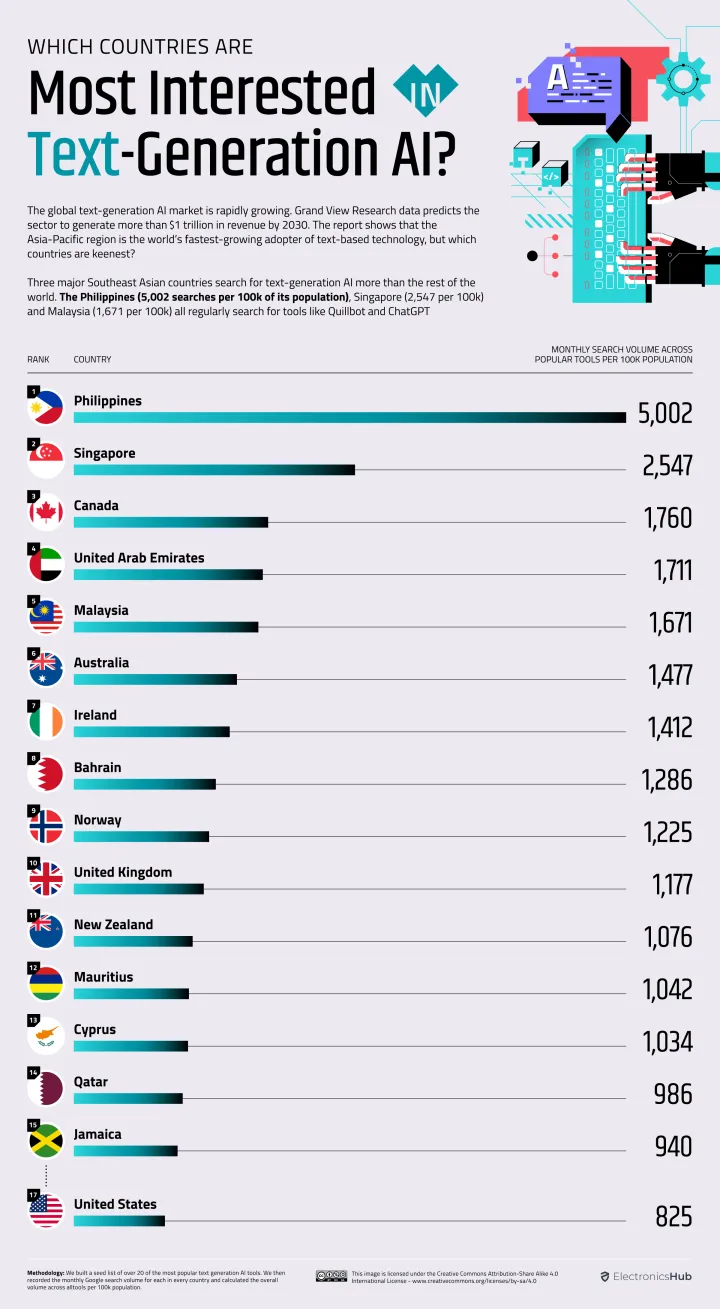 在所有人工智能工具的总和中,菲律宾的月搜索量是所有国家中最高的。它也是使用人工智能生成文本的人数最多的国家,每10万人中有5002次搜索。新加坡和加拿大紧随其后,人工智能文本生成的搜索量分别为2547次和1760次。美国排名低得多(第17位),每月每10万人有825次搜索量。