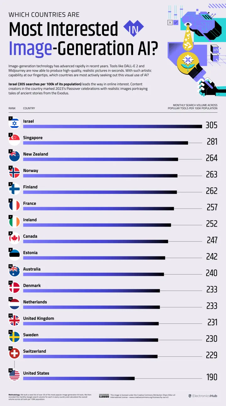 世界各地使用人工智能创建图像的人比使用文本的人更少。以色列在人工智能图像搜索方面排名第一,每10万人中有305人。该研究称:“中国的内容创作者用现实主义的图像描绘了《出埃及记》中的古代故事,以庆祝2023年的S逾越节。”