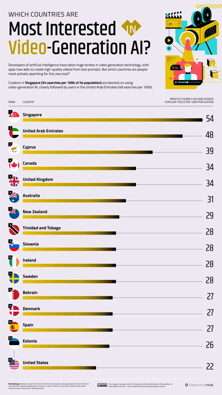 大多数国家在用人工智能制作视频方面只触及了皮毛。新加坡排名第一,每月每10万人有54次搜索,紧随其后的是阿联酋(54次)和塞浦路斯(39次)。