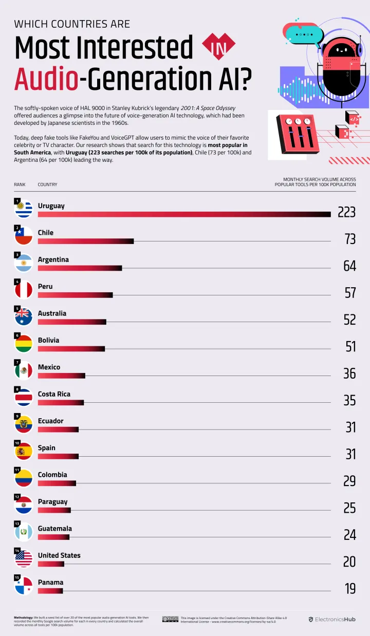 拉丁美洲国家在人工智能生成的音频方面处于领先地位。乌拉圭排名第一(223人),其次是智利(73人)、阿根廷(64人)和秘鲁(57人)。全球最受欢迎的人工智能音频工具是FakeYou,月搜索量为17.2万次。