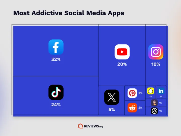 人们最初被问到他们使用什么社交媒体的问题,但他们也被问及哪种社交媒体最容易上瘾。Facebook拥有近三分之一的用户,位居榜首,但最容易上瘾的第二大用户是TikTok。YouTube排在第三位。