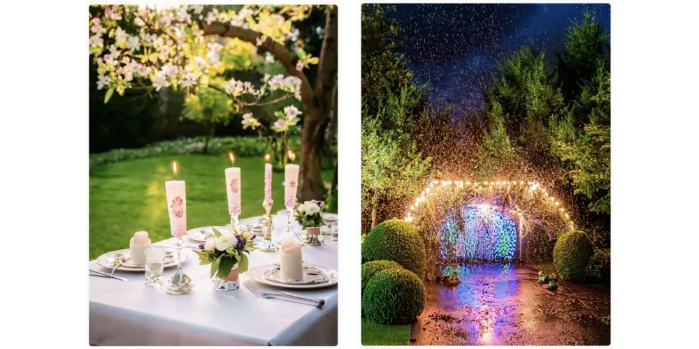3.情感。通过引用喜悦、悲伤、宁静或兴奋的特定情绪,为你的提示注入活力。例如,想想我写的这两个提示,它们相似,但产生了完全不同的设计:“春天下午的花园派对”(如左图所示)和“只有彩色的萤火虫辫子弧线照亮的下雨的暮色花园招待会”(右下)。