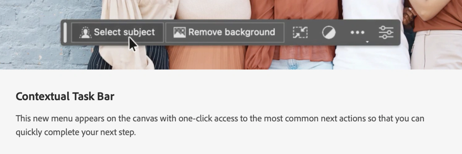 新的任务栏(让人想起Adobe的iPad应用程序、Illustrator、Photoshop和Fresco中的那些)不仅是上下文的,而且还预测了你可能的下一步行动。