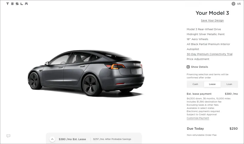 据Inside Evs报道,今年1月,特斯拉为潜在租户提供了更优惠的交易,将费用降至每月399美元。现在,后轮驱动的基本Model 3的三年租期更低–每月380美元(购买一辆略高于4万美元的车)。