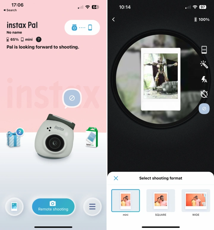 直接打印非常容易使用,可以让你在没有连接智能手机的情况下使用相机进行打印。将底部的模式开关从F(用于娱乐)位置移至L,将其设置为链接模式。打开Pal和打印机的电源,将它们放在一起,您应该会看到两个都闪烁的绿灯,并发出一些哔哔声。拍摄一张快照后,Pal将其直接发送到打印机,相机的指示灯呈紫色闪烁,让您知道正在发生。