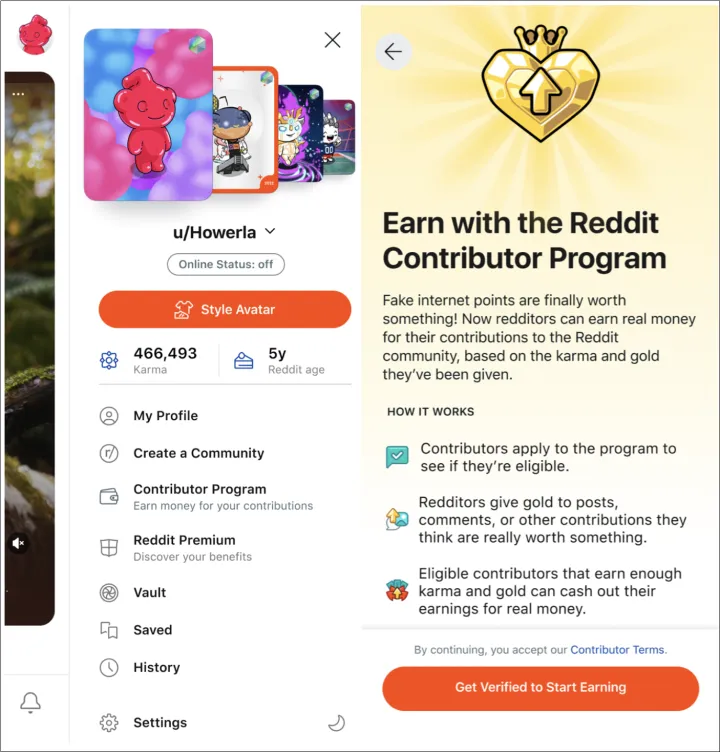 美国感兴趣的用户可以通过访问他们在Reddit上的个人资料页面来加入贡献者计划。该公司在一份支持文件中写道:“在移动设备上,点击右上角的头像即可打开侧边抽屉。”“在reddit.com上,点击右上角的用户名,下拉菜单就会出现。您将看到Contributor计划的一个选项卡,旁边有一个钱包图标。选择此选项可打开营销页面。如果您符合条件,则可以点击Get Verify to Start Income按钮。