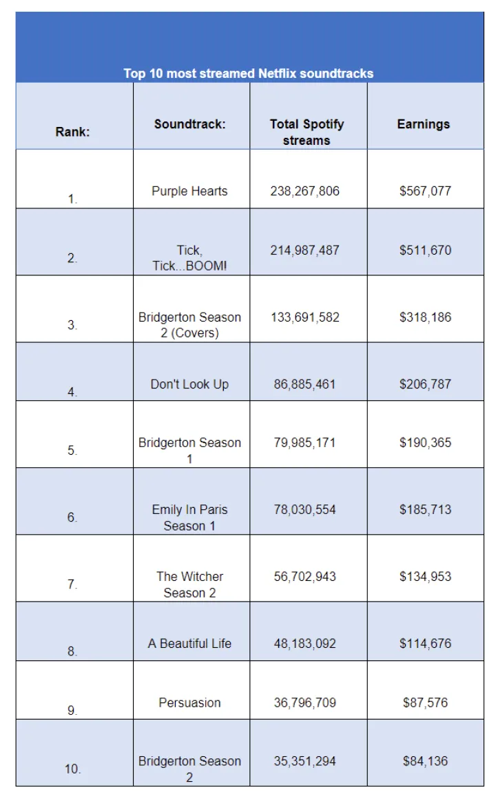 一家数字耳机杂志最近在Spotify上查看了Netflix的音乐收藏,以确定其配乐从流媒体中赚了多少钱。以下是他们的发现: