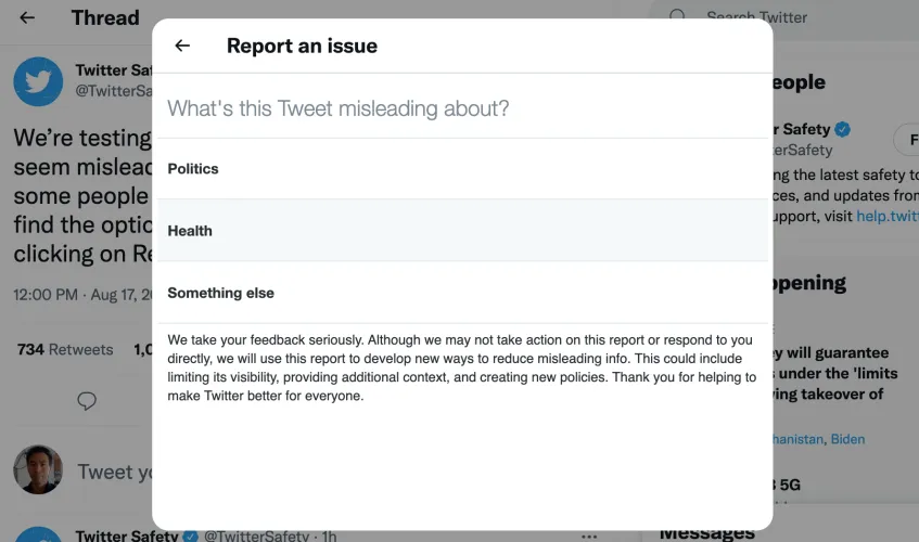 2021年,推特开始测试,允许美国、韩国和澳大利亚的用户直接向该平台的内容版主报告一条误导性的推文。它允许你将一条推文报告为“误导性的”,然后向下钻取,说它与政治有关。如果你点击政治,该公司会询问所谓的错误信息是否与选举有关。