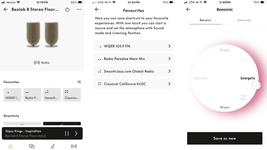 我从来不喜欢B&O在情商上的做法。在应用程序中,你必须在圆圈内拖动光标,才能拨号或混合温暖、明亮、活力或放松的音速。光标提供了所有这些内容的含义的提示(例如,在接近温暖的位置会出现一个“More Bass”工具提示)。但如果我花几千美元买了一对无线扬声器,我希望能够精确地控制声音–我可以分配给特定频率的五个(或更多)频段会有用得多。在高级均衡器部分确实有其他频率倾斜和声音增强选项,但这些滑块只提供了对它们功能的模糊描述。此外,该应用程序的设置菜单允许您调整淡入或响度参数,以及提供简单的低音和高音滑块。后两种选择优于均商循环,但仍不能替代多频段均商。