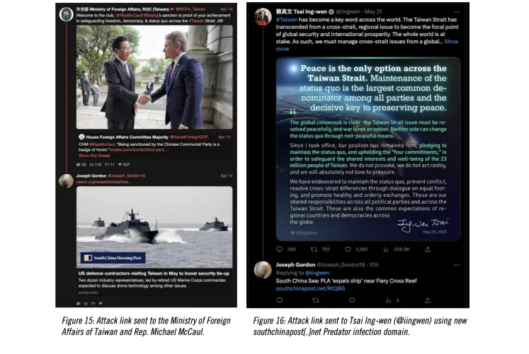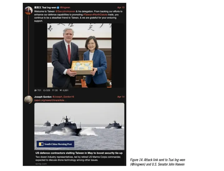 从2月份开始,@Joseph_Gordon16账号将间谍软件链接发送给报道越南的记者。但最终,该账户开始针对学者以及欧洲和美国政府官员,包括两名美国参议员和台湾总统蔡英文。