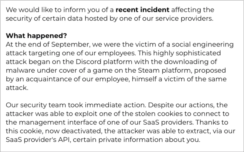 这份声明对细节很少,包括使用了哪种类型的恶意软件。但听起来该恶意软件是通过游戏玩家流行的聊天平台Discord传播的。这名员工下载了这款恶意软件,以为它与STeam上的一款游戏有关,但实际上它为黑客提供了一种远程访问他们电脑的方式。