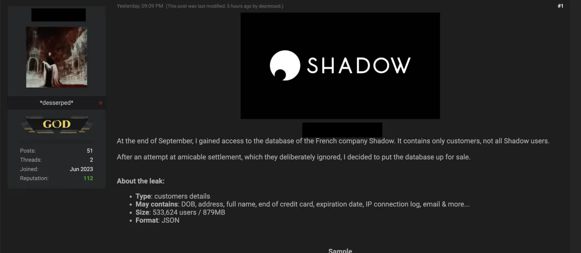 好消息是,没有客户的密码或敏感银行信息在攻击中被洗劫一空。然而,看起来黑客现在正试图出售被盗的信息。BleepingComputer注意到,在一个流行的黑客论坛上,一名用户声称可以访问Shadow的533624名用户的数据。