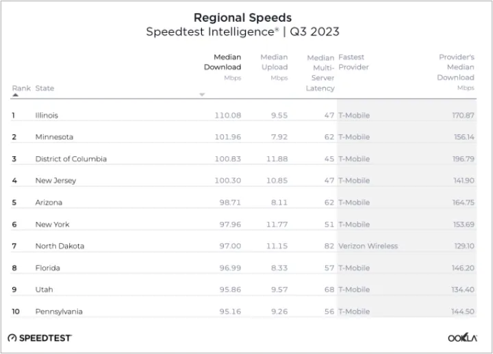 如果你在T-Mobile上使用iPhone,下一个问题是它在哪里表现最好。伊利诺伊州以最快的中值下载速度(110.08 Mbps)位居第一,其次是明尼苏达州(101.96 Mbps)和哥伦比亚特区(100.83 Mbps)。