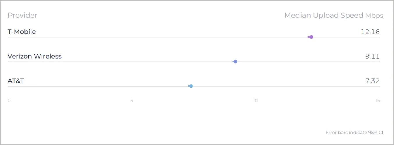 T-Mobile的上传速度中值也是全美最快的,为11.31 Mbps。同样,这比第二季度S 12.16 Mbps的速度略有下降,但仍然远远高于竞争对手。
