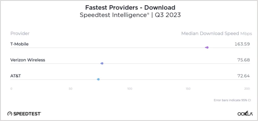 在测试的几乎所有方面,T-Mobile都位居榜首–就像上个季度一样。就中值下载速度而言,T-Mobile在第三季度为163.59 Mbps。这比2023年第二季度的164.76和第一季度的165.22略有下降,但仍几乎是威瑞森和AT&T的两倍。