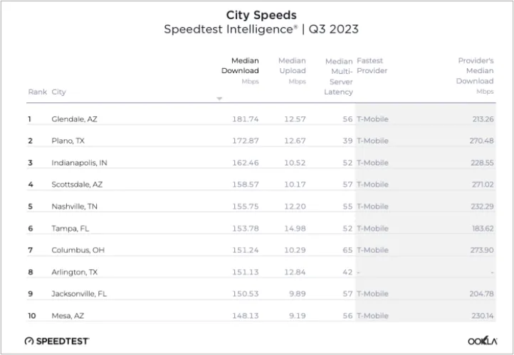 然而,许多速度最快的城市都在其他州。亚利桑那州的格伦代尔以令人印象深刻的181.74 Mbps的下载速度位居榜首。得克萨斯州的普莱诺位居第二(172.87),紧随其后的是印第安纳州的印第安纳波利斯(162.46 Mbps)。