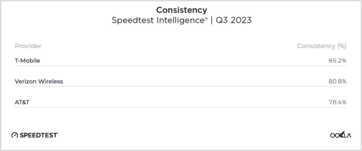 每家航空公司业绩的一致性也是如此。“我们发现T-Mobile在2023年第三季度在美国拥有最高的一致性,85.2%的结果显示下载速度至少为5 Mbps,上传速度为1 Mbps,”研究称。Verizon Wireless和AT&T紧随其后,分别为80.8%和78.4%。