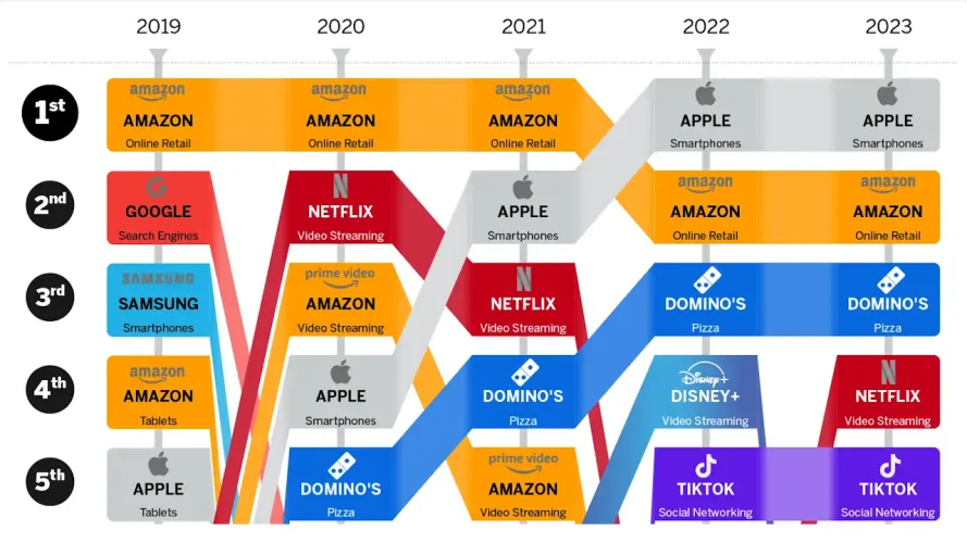 虽然自2019年以来,一些事情发生了根本性的变化–比如Domino‘s Pizza从第15位飙升至第3位,或者几年前TikTok的“一夜之间”出现–但一些品牌仍然非常稳定。