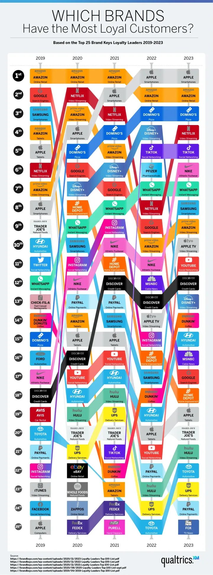 每年,咨询机构Brand Keys都会发布年度客户忠诚度排行榜,根据各自客户的忠诚度对100个顶级品牌进行排名。这是一份耐人寻味的报告,也是该公司过去15年来一直在做的一份报告。为了给这个故事增添一些历史背景,体验管理公司Qualtrics回顾了过去五年忠诚度排行榜上排名前25位的公司。其结果是对品牌忠诚度如何随着时间的推移而演变的独特观点。