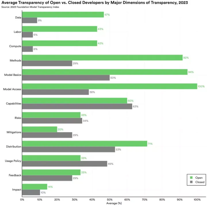 该研究称:“当今人工智能领域最具争议的政策辩论之一是,人工智能模型应该是开放的还是封闭的。”斯坦福希望基础模型指数将影响积极的政策变化,并计划每年发布FTMI,2023年是第一年。