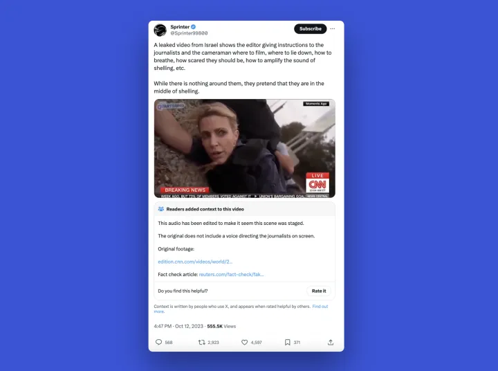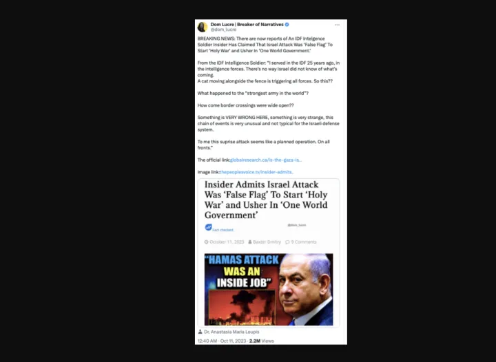 这份报告来自NewsGuard,一家生产识别错误信息的工具的公司。该组织查看了推特上最受欢迎的250篇帖子,这些帖子宣扬了关于以色列-哈马斯战争的明显虚假或未经证实的说法。