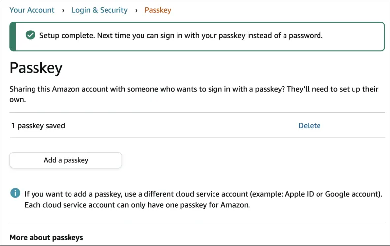 因此,亚马逊表示:“密钥不容易受到网络钓鱼攻击,这使得它们比短信中的一次性代码等功能更安全。”