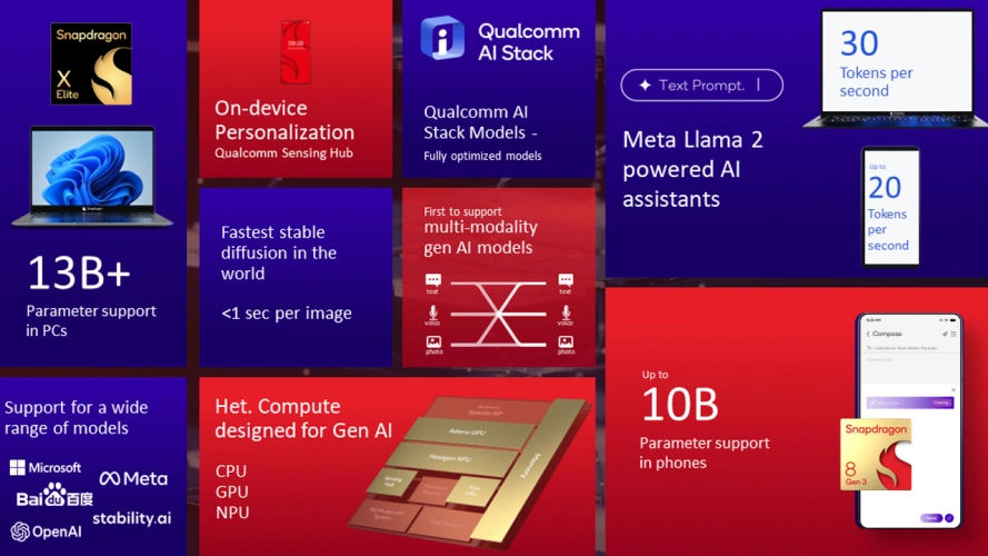 该公司已经安排了一些硬件合作伙伴,计划支持高通最新芯片的人工智能功能,包括百度、Bloom、Meta、微软、OpenAI、RWKV和有道。