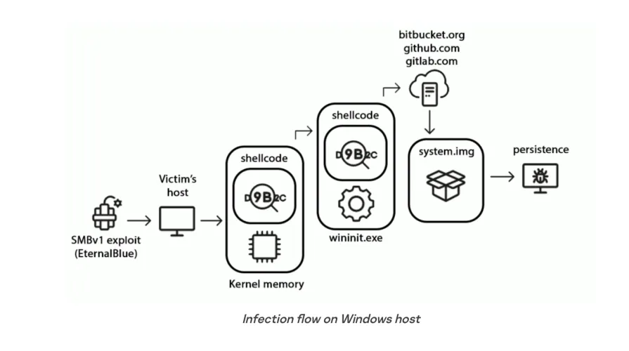 根据卡巴斯基的说法,StriedFly使用自己定制的EternalBlue攻击渗透到没有打补丁的Windows系统,并悄悄地在受害者的网络中传播,包括到Linux计算机。然后,该恶意软件可以从受感染的计算机中获取敏感数据,如登录凭据和个人数据。
