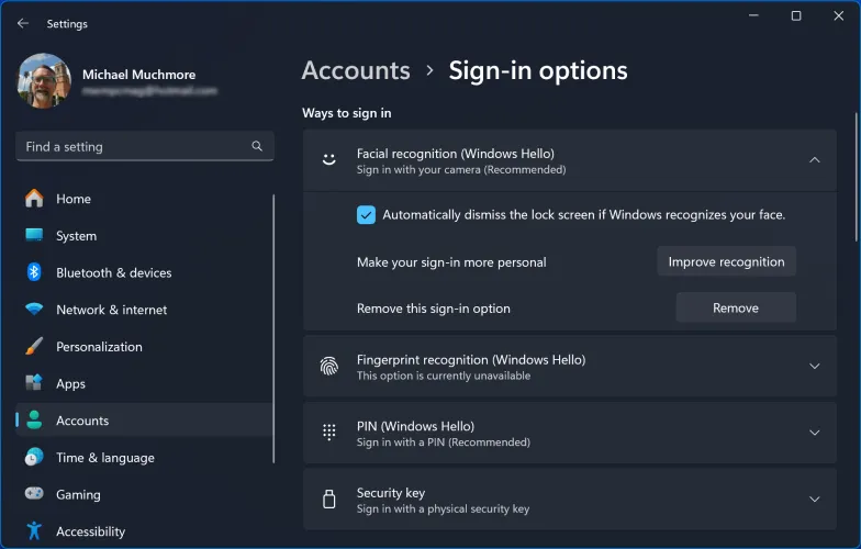 Windows 11使用一个名为Hello的系统来登录你的生物识别系统,你有几个选择。使用支持深度映射的网络摄像头登录人脸可能是最酷、最快的,而且它可以在大多数高端电脑上使用,包括所有Surface设备。Windows Hello还支持指纹识别器,可在惠普Pavilion Plus 14等笔记本电脑上使用。如果你的硬件与这些功能中的任何一个都不兼容,Windows也会接受PIN,这比完整的密码更方便。事实上,PIN与当前机器捆绑在一起–而不是像标准账户密码那样在线存储–而且四个不正确的输入会暂时将你锁在外面,这使得它非常安全。