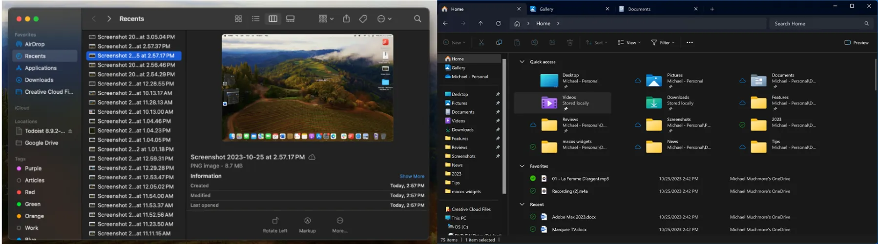 文件资源管理器在最近的Windows更新中得到了改进。主文件夹的快速访问是一项最受欢迎的功能,因为它使您可以很容易地找到您保存的最后一个文件,无论它是什么文件或保存在哪里。您还可以在此处固定文件夹。MacOS Finder的Recents文件夹的工作原理类似,Finder也有一个收藏夹部分,尽管我发现它比文件资源管理器更难使用,特别是在从一个驱动器上的一个位置到另一个位置时。