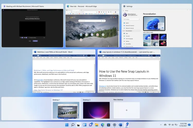 Windows11的S(音译)窗口操作的便利性继续得到改善,它提供了快照布局等功能,让你可以从任何程序的最大化按钮选择窗口排列方式。如果你将应用程序的顶栏拖到屏幕顶部,以查看布局选择,那么平板电脑的触控界面也可以使用同样的方法。你甚至可以重复使用任务栏图标中的这些布局,如果你在辅助显示器上使用它们,它们也会被记住。