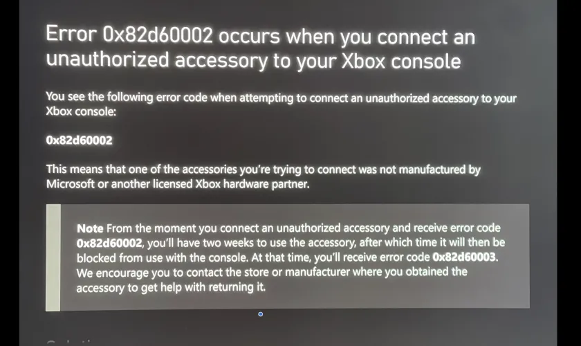 本月早些时候,几位Xbox用户报告说看到了一条神秘的“Error 0x82d60002”消息,称他们的第三方控制器是“未经授权的附件”。