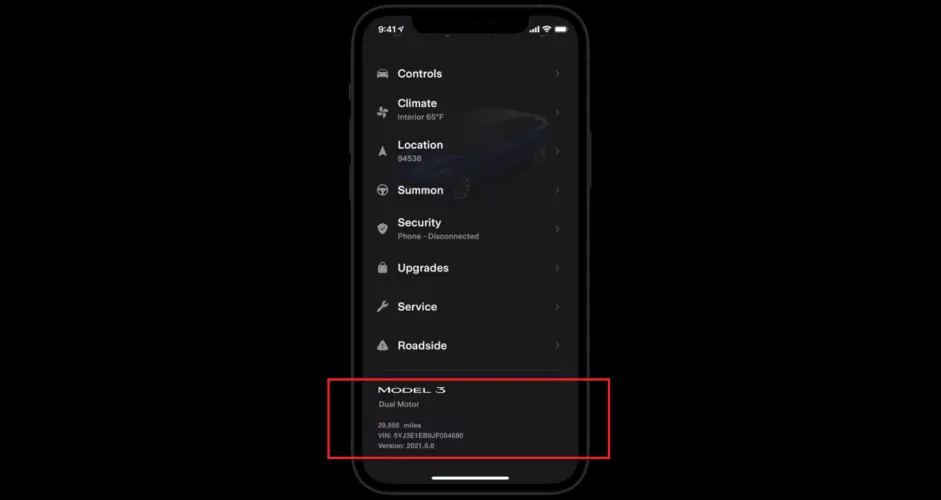 要检查你的特斯拉正在使用的软件版本,请打开特斯拉应用程序的主屏幕,在那里它会显示车辆的图片。向下滚动到底部以找到型号名称。下面是小字体的总里程数、车辆识别码和软件版本。