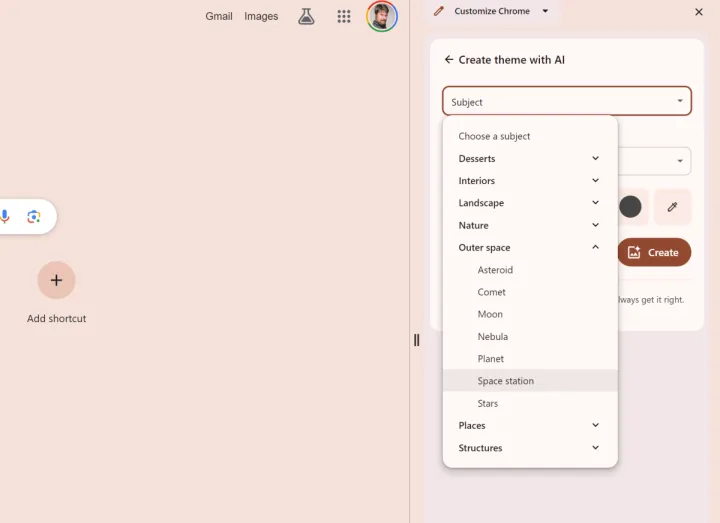 当你打开一个新标签时,你会在右下角看到一个小的“铅笔”图标或一个“定制Chrome”图标。点击它,你就可以选择更改桌面主题。“用AI创建”是菜单树中一个略显隐蔽的选项,隐藏在“改变主题”之后。在这里,谷歌采用了背景建议,而不仅仅是空白提示。你将能够从不同的场景和情绪中选择,以创建如本页顶部所示的图像。
