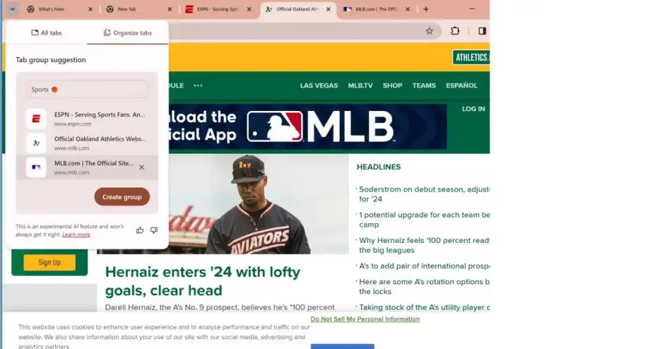 人工智能支持的标签分组似乎是最有用的新功能。有一个小问题:即使在更新之后,AI分组也不能工作,除非是在新创建的选项卡上,至少目前是这样。您将无法对现有选项卡进行分组。然而,一旦你创建了一些新的标签,比如我在下面创建的面向棒球的标签,右击一个标签并选择“组织类似的标签”,就会使用人工智能来搜索并分组相关的标签。