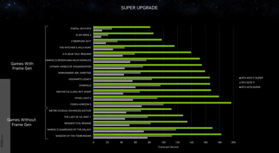 所有这些改进的规格自然意味着更好的性能…但在不同的情况下,“表现”意味着不同的东西。随着内核时钟频率几乎与RTX 4070钛相同,Super Variant在CUDA内核(8448比7680)以及先前寻址的扩展视频内存和内存总线方面有了显著改进,从而脱颖而出。