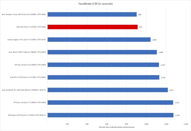 我们的手刹基准测试笔记本电脑如何能够在很长一段时间内处理沉重的CPU负载-在这种情况下,使用免费视频编码实用程序Hand Brake将一个30 GB的MKV文件转码为适合Android平板电脑的格式。戴尔G16位居第二,仅次于宏碁Predator Triton 300 SE,这对机型比其他机型有很大优势。