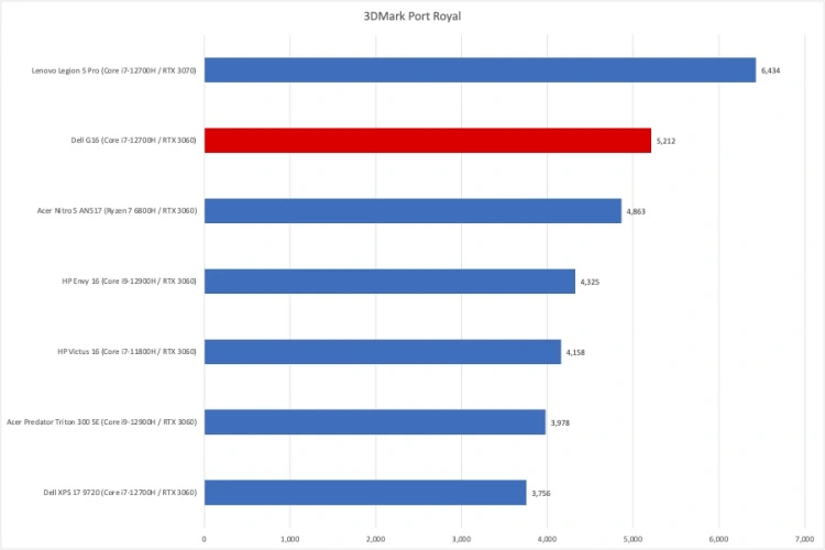 我们的第一个3D图形测试是来自3DMark-Time Spy和Port Royal的两个基准测试。戴尔G16在两次测试中都表现出色,在RTX 3060系统中排名第一,仅落后于基于RTX 3070的Lenovo Legion 5 Pro。