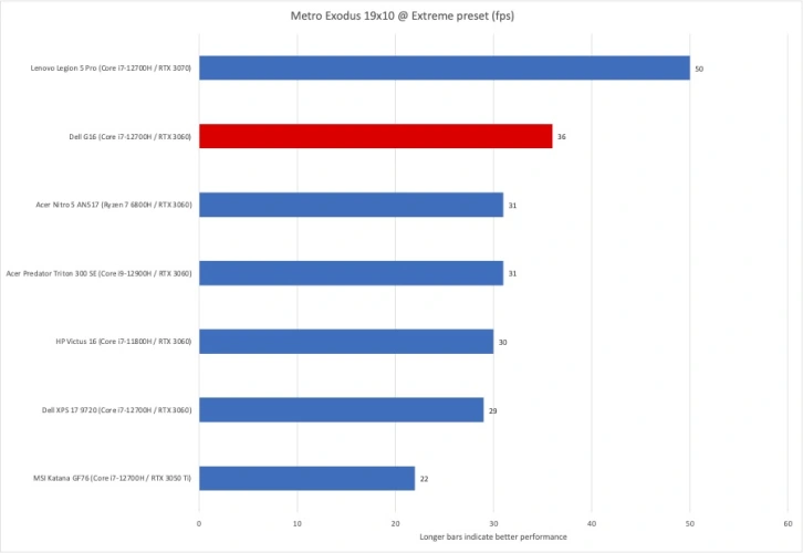 继续现实世界的游戏,我们首先在DX11模式下运行1920×1080分辨率的《古墓丽影》。Dell G16的帧速率为131 fps,在腾讯通3060系统中名列前茅。在1920×1080分辨率的较新款《古墓丽影》上,Dell G16的平均分辨率达到了令人印象深刻的114fps,再次位居RTX 3060笔记本电脑之首。最后,在要求更高的Metro Exodus上,在基准的极端预设下,1920×1080的速度,Dell G16的平均速度为36fps,比其他RTX 3060笔记本电脑快几帧/秒,仅落后于基于RTX 3070的Lenovo Legion 5 Pro的50fps。