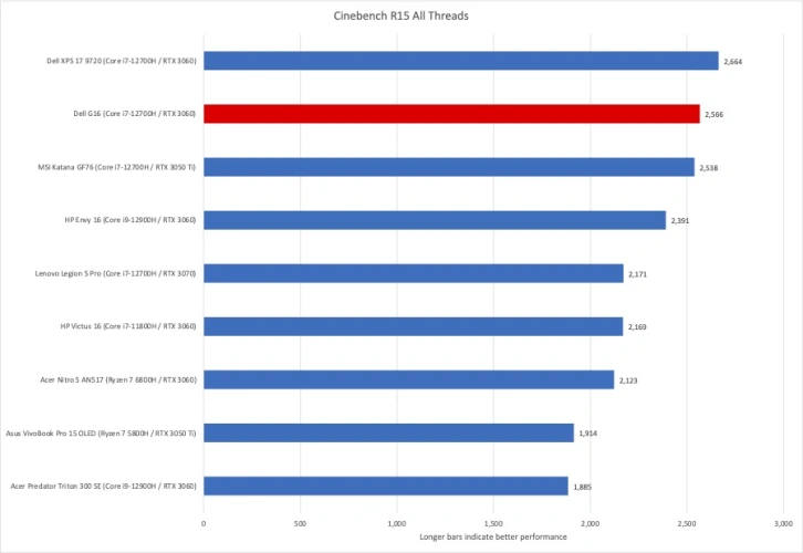 接下来是Cinebench,这是另一个CPU密集型测试,但可以在短时间内渲染复杂的2D场景。Dell G16再次位居第二,这一次落后于Dell XPS 17 9720。两个戴尔连同微星卡塔纳GF76是电影院的明显赢家。